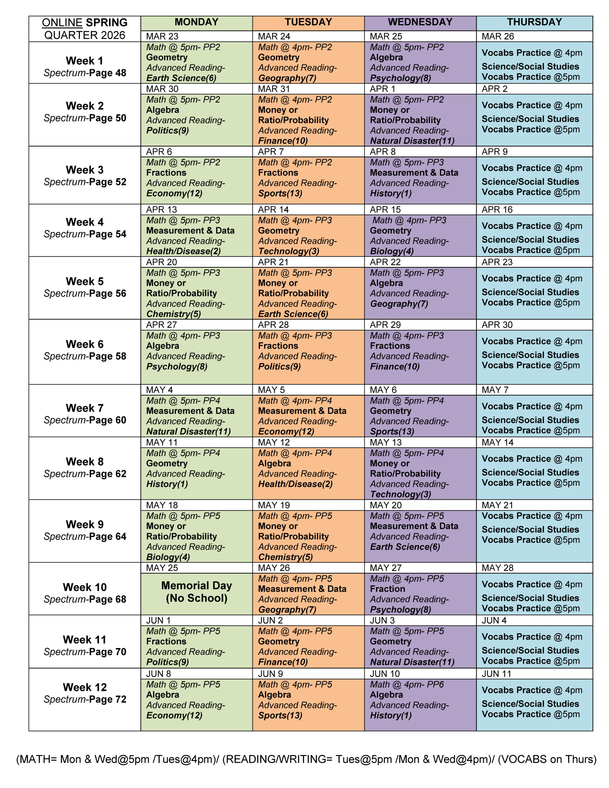 Click on the image below to check out our schedule. We are located in Seattle, WA (PST). Our after-school program starts at 4pm and ends around 6pm. Each session is roughly about one hour but the curriculum is only 45 minute long. Students check in/log in at 4pm and we start class together at 4:10pm and end the class at 4:55pm, the last 5 mins are for questions. Again, students check in/log in at 5pm but the class do not start until 5:10pm and ends promptly at 5:55pm, the last 5 mins are always for questions.